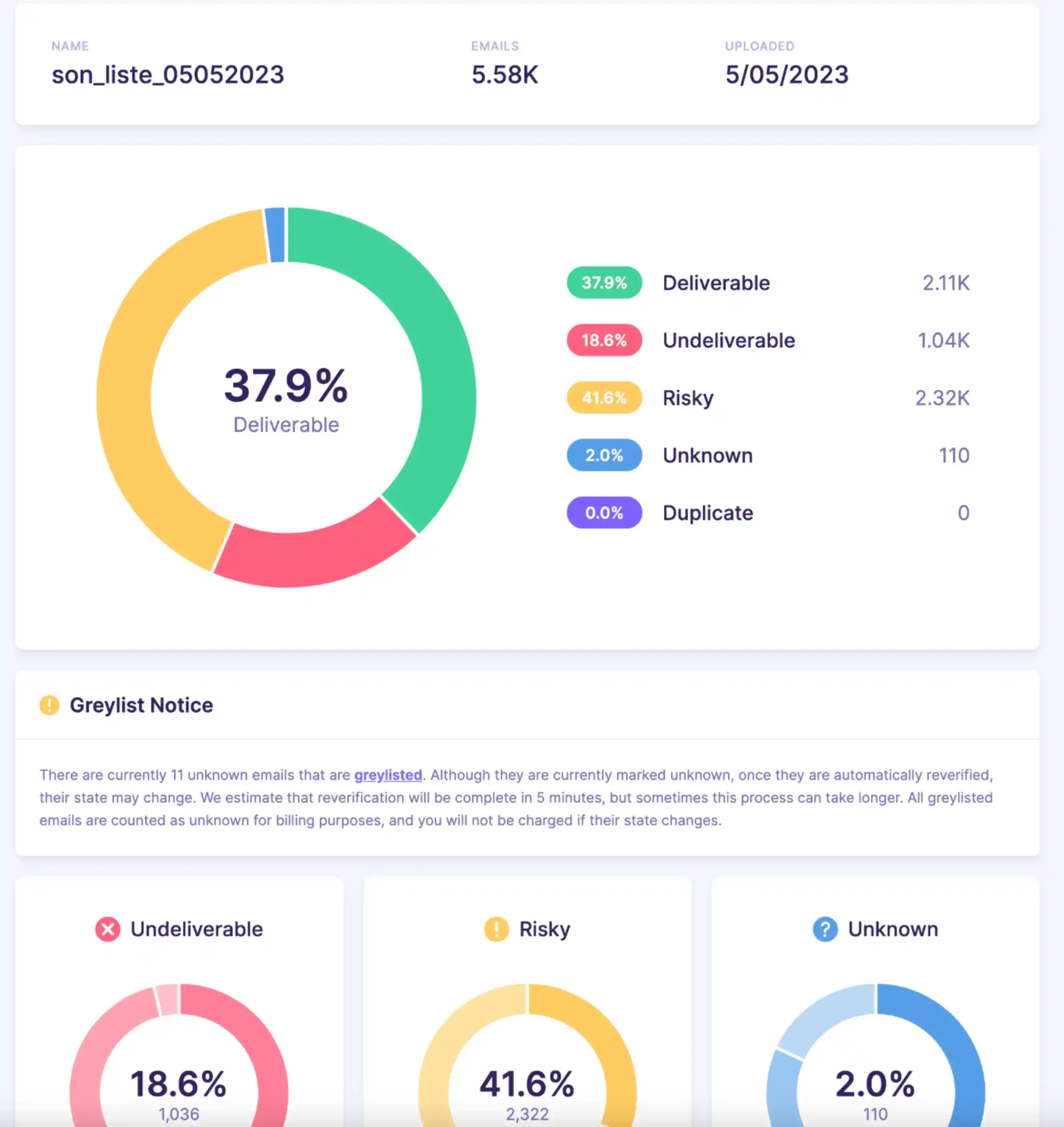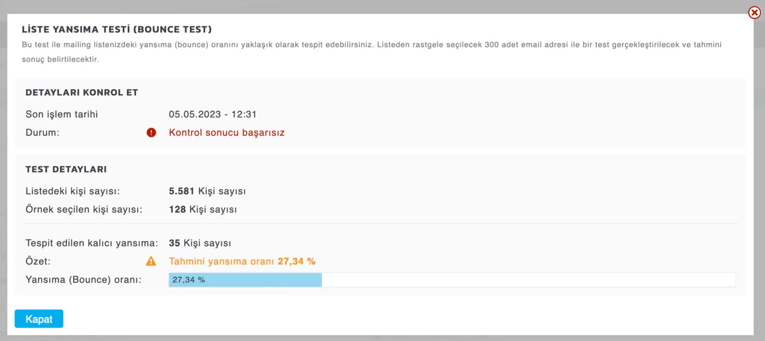 Yukarıdaki görselde gerçek bir müşteri listesinin bounce testi sonucu görülüyor, %27,34 olası bounce tespiti. Bu oran %5 eşiğinin çok üzerinde olduğu için liste email doğrulama hizmetine yönlendirildi.