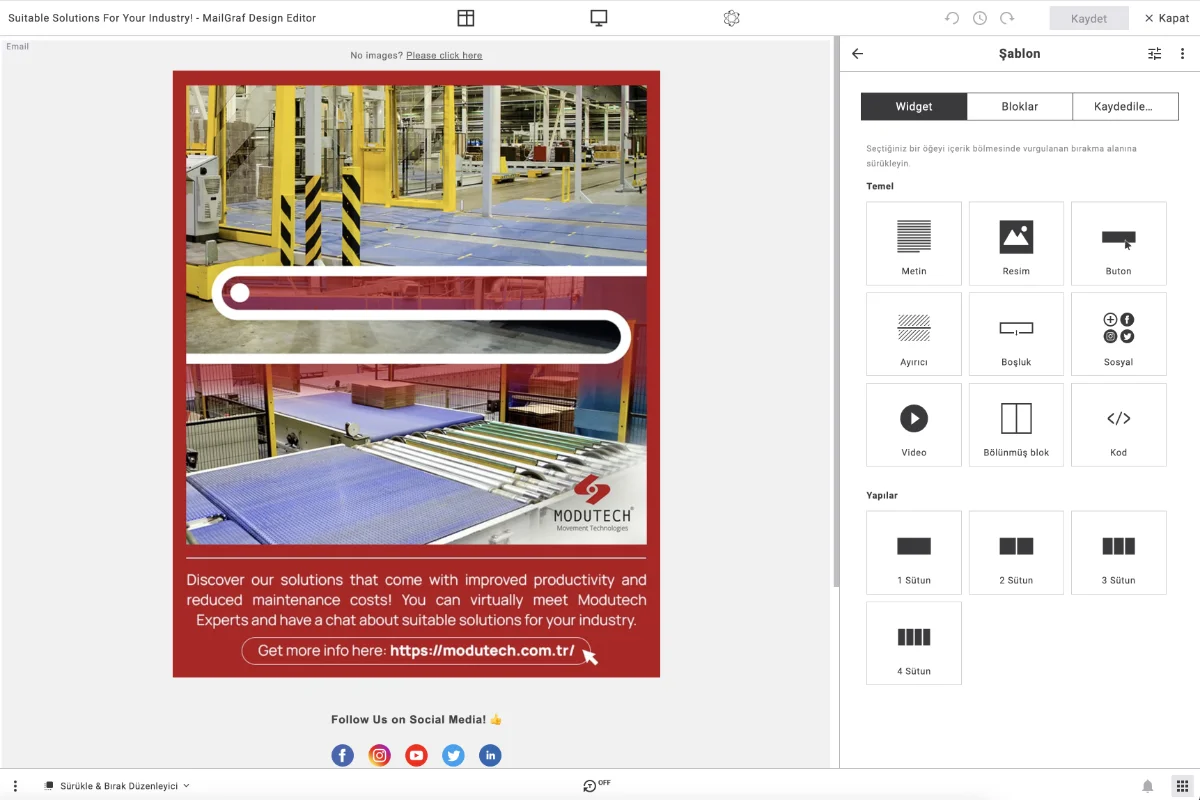 Editörün güçlü yönlerinden biri modüler çalışma yapısıdır. Sık kullandığınız bileşenleri (logo bloğu, CTA butonu, footer, ürün kartı) "kaydedilen modüller" kütüphanesine ekleyebilirsiniz. Sonraki kampanyalarda bu modülleri sürükle-bırak ile yerleştirip yalnızca içeriği değiştirirsiniz. Bu yaklaşım hem tasarım süresini kısaltır hem de kampanyalar arasında marka tutarlılığını korur.