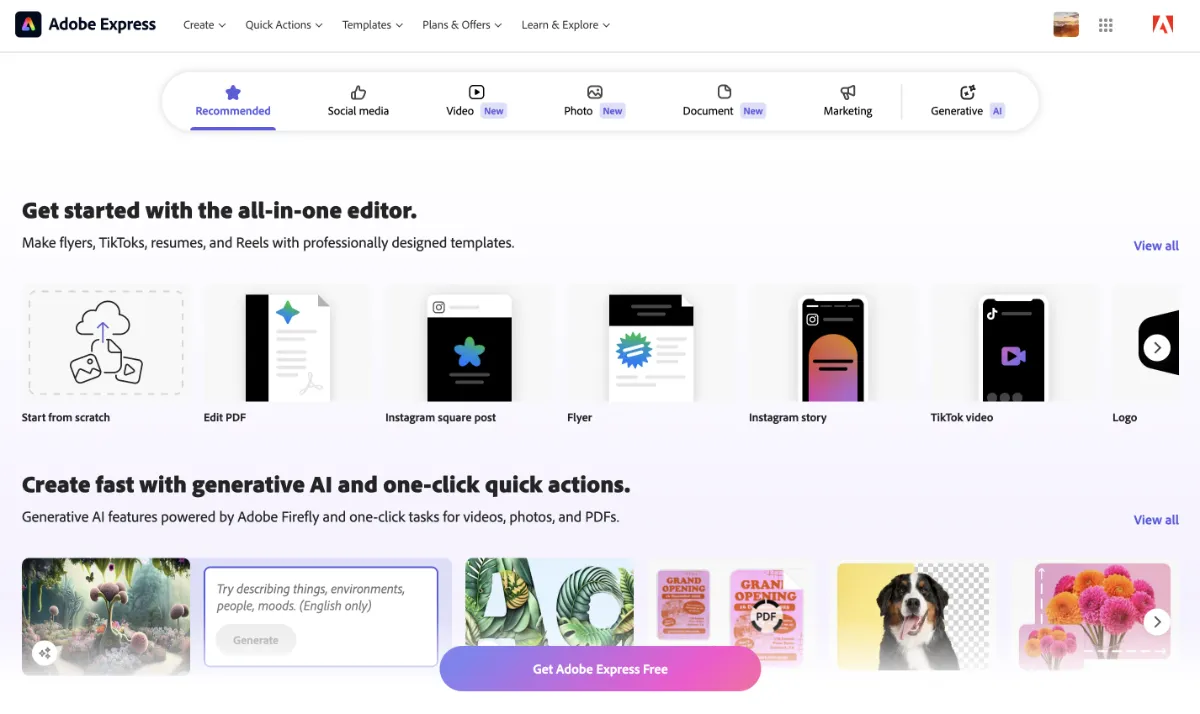 Adobe Express, hızlı görsel tasarım için kullanılabilecek bir diğer araçtır. Hazır şablonlar, marka kiti ve kolay dışa aktarma sunar. Canva'ya benzer bir kullanıcı deneyimi vardır. Adobe ekosistemiyle entegre çalışması avantajdır. Büyük ölçüde ücretsiz kullanılabilir.